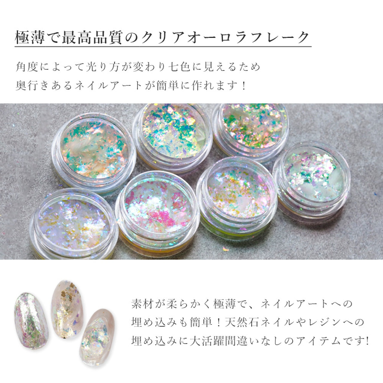 フレークは薄く軽いので散らしやすく、レジンに閉じ込めると透明感のある輝きが出ます。